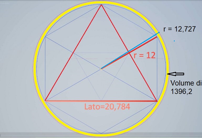 Facciamolo: quattro diviso tre = 1,333 X 3,14 X 12,727 X 12,727 X 12, 727 = 8630,70 Volume della sfera che contiene il tetraedro di Lato 20,784