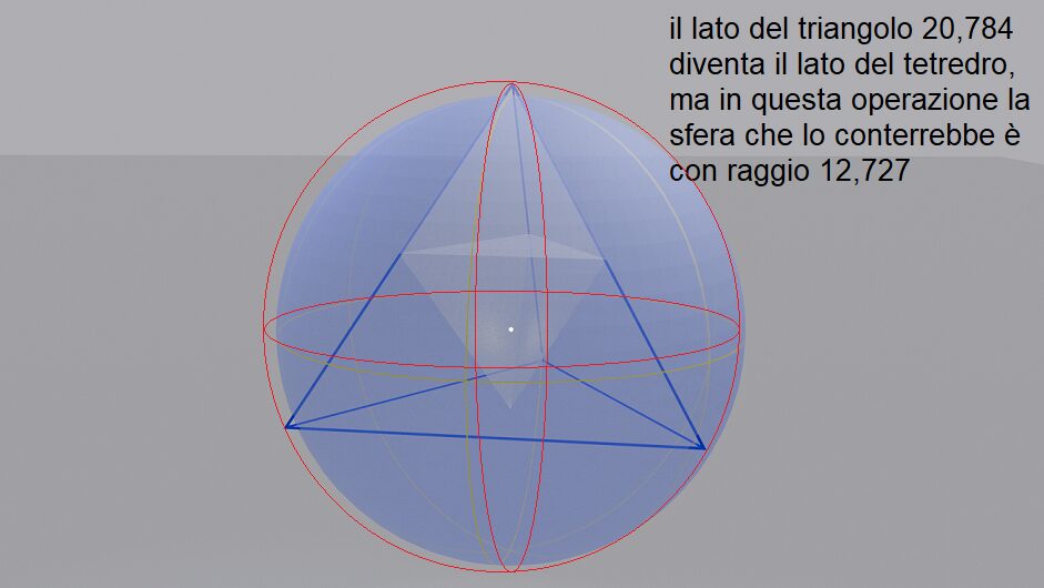 Il cerchio di raggio 12 circoscrive un triangolo di 20,784 cm, tridimensionando il cerchio, la sfera che si ottiene è una sfera ri raggio =12 cm, ma il triangolo diventa un tetraedro il cui lato di 20,784 sporge ( buca la superficie della sfera di raggio 12) sulla superficie esterna.