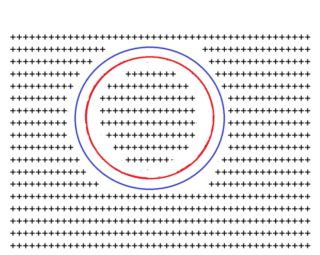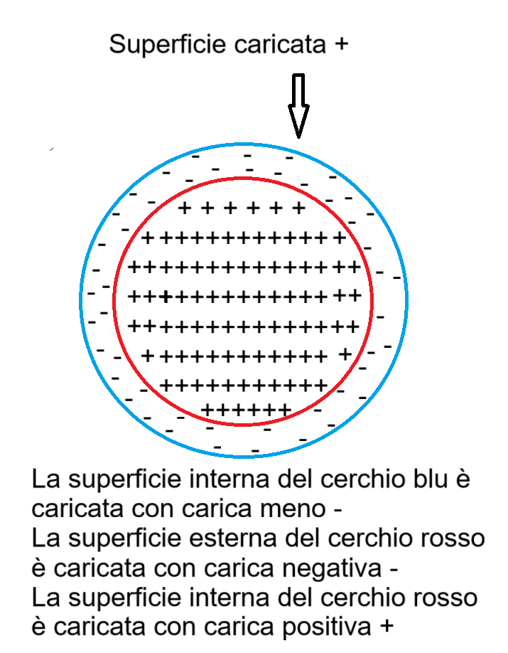 C’è bisogno di una seconda barriera (il cerchio rosso) caricata così: l’esterno del cerchio rosso è caricata con cariche meno (-), questo è evidente perchè se fosse caricata col segno + avremmo una annichilazione di carica.
